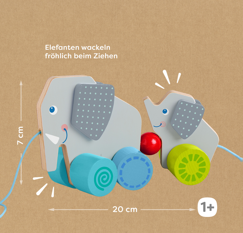 Ťahanie dvoch slonov za sebou podporuje plazenie a chôdzu, zatiaľ čo kývajúce sa a poskakujúce slony pridávajú nekonečné chichotanie a zábavu!