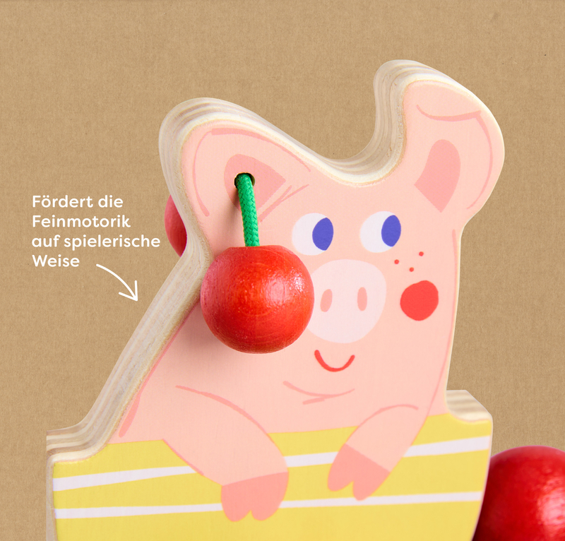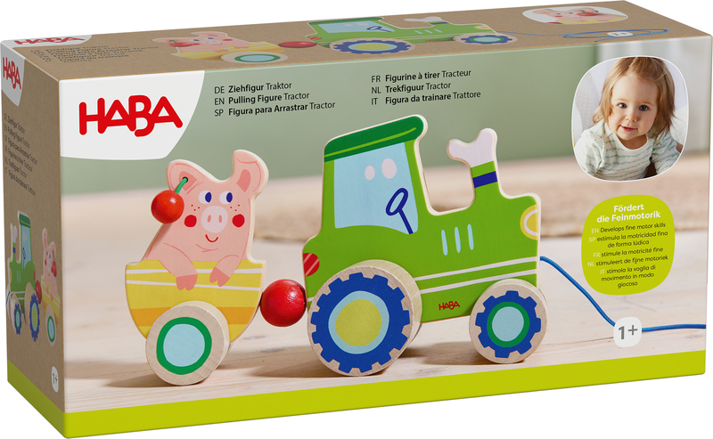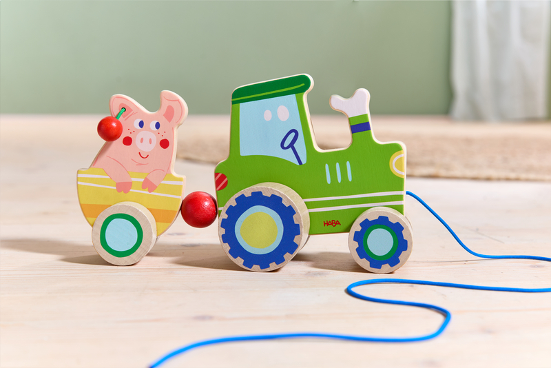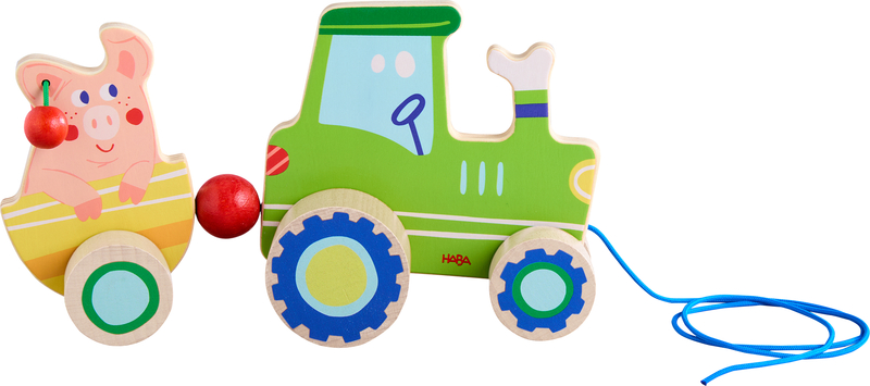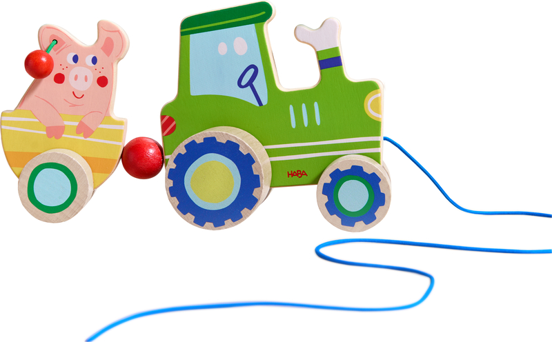 Traktor je málokedy sám – tento vezie hravého pasažiera! Malé prasiatko s hrkálkami v tvare čerešne na ušiach, ktoré sedí v prívese, prináša s každým pohybom príjemné prekvapenie.