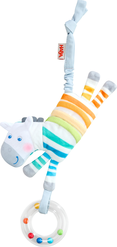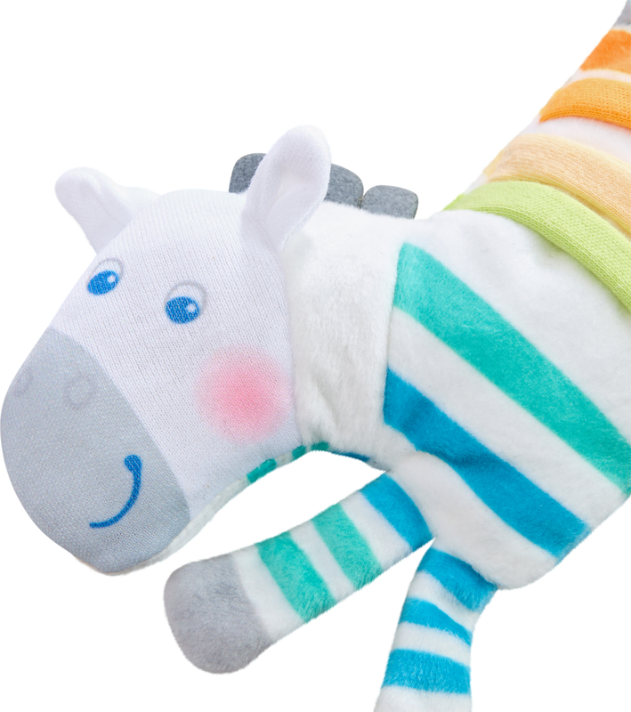 Tento hravý spoločník sprevádza bábätko všade a dá sa ľahko pripevniť na kočík, detskú autosedačku alebo postieľku vďaka praktickému zapínaniu na suchý zips.