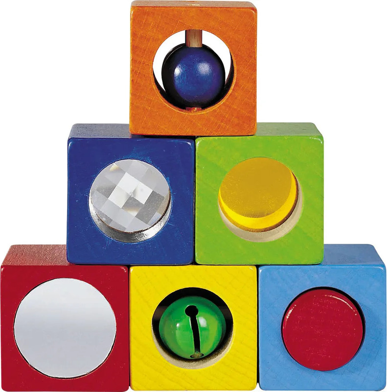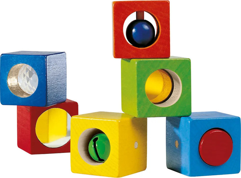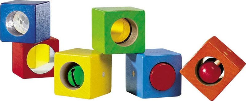 Súprava senzorických drevených kociek pre deti od 12 mesiacov. Kocky sú rôznych farieb a každá z nich ponúka vlastnú aktivitu s vizuálnym alebo zvukovým efektom – rolničku, korálku, zrkadielko či kaleidoskop. Deti sa zabavia objavovaním rôznych prekvapení a zároveň si hrou rozvíjajú jemnú motoriku a precvičujú základné zmyslové vnímanie – zrak, sluch a hmat.