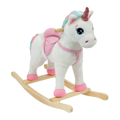 Moderný a jedinečný design tradičnej hračky. Vyrobené z hladkého a pevného kaučukového dreva s bezpečnou konštrukciou. Jednorožec má detailné ilustrácie v jemných pastelových farbách doplnené trblietkami a zlatými prvkami. Sedlo je svojou výškou a tvarom prispôsobené deťom od 1 roku.