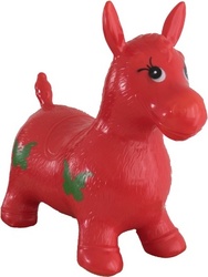 Gumové červené nafukovacie skákadlo pre deti, v tvare poníka z gumy, s motýlikmi, balené vo vyfúknutom stave v sáčku.