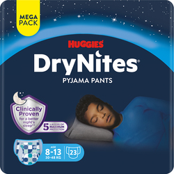 DryNites® naťahovacie nohavičky na noc pre deti vo veku od 8–13 rokov a s hmotnosťou 30-48 kg poskytujú vášmu dieťaťu spoľahlivú ochranu pri nočnom pomočovaní, aby cez noc zostalo v suchu.