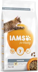 Krmivo IAMS for Vitality pre dospelé mačky a mačacie seniorov žijúce v byte je 100% kompletné a vyvážené, odborníkmi zostavené krmivo, ktoré bude vášmu zvieraťu chutiť a svedčiť. Naša nová a vylepšená receptúra s čerstvým kuracím mäsom je založená na kvalitných živočíšnych bielkovinách starostlivo vybraných tak, aby podporovali sedem znakov zdravej vitality mačky. Aby boli mačky zdravé, aktívne a plné energie, obsahujú naše lahodné receptúry až 89 % živočíšnych bielkovín (z celkového obsahu bielkovín). Naša receptúra pre mačky chované v byte dokonale prispieva k zachovaniu štíhlej a zdravej telesnej stavby. Našim záväzkom je ponúknuť mačkám špecializované krmivo so skvelou chuťou, ktoré si váš domáci maznáčik bezvýhradne zamiluje a ktoré bude podporovať všetkých sedem znakov zdravej vitality. Oproti nášmu bežnému krmivu IAMS pre dospelé mačky s čerstvým kuracím mäsom obsahuje táto receptúra o 14% menej tuku na zachovanie štíhlej telesnej stavby a zdravej kondície. Vďaka vyváženému obsahu omega-3 a omega-6 mastných kyselín v krmive IAMS budete môcť obdivovať zdravú kožu a lesklú srsť svojho zvieraťa. Svoje receptúry sme vyvinuli tak, aby znižovali pH v močovej sústave a udržali ju zdravú. Pripravte sa, že vaša mačka bude skákať a vyčíňať. To vďaka kvalitným bielkovinám a nevyhnutným minerálom, ktoré pomáhajú udržať zdravé svaly a kosti. Kombinácia antioxidantov s vitamínom E posilňuje imunitu, takže ju už pri výpravách nič neohrozí. A keď ju budete počuť chrúmať naše granule s vyváženým obsahom minerálov v každom súste, môžete si byť istí, že bude mať silné a zdravé zuby. Pri upratovaní mačacej toalety oceníte zdravé trávenie mačky vďaka optimálnej kombinácii vlákniny, prebiotík a repnej dužiny. Naše krmivá navyše obsahujú základné živiny, ako napr. taurín, pre zdravé srdce, aby vám váš miláčik nikdy neprestal prejavovať lásku. Krmivo IAMS podporuje sedem znakov zdravej vitality, ktoré na svojom zvierati budete s radosťou pozorovať každý deň. Kŕmny návod: viď tabuľka na obale.
