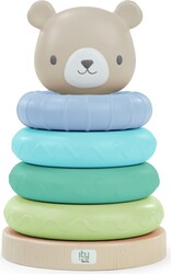 Pyramída a super roztomilý medvedík Nate sa dodávajú so stojanom z umelého dreva a 4 farebnými, ľahkými prstencami s viacerými textúrami bez obsahu BPA, ktoré sa bábätku ľahko držia a stohujú.