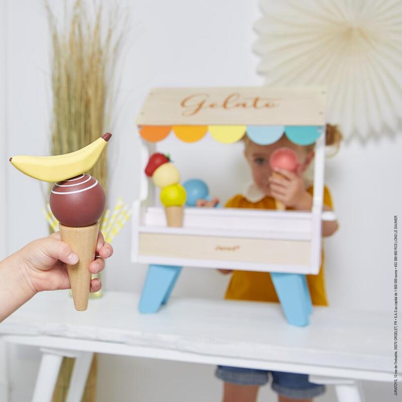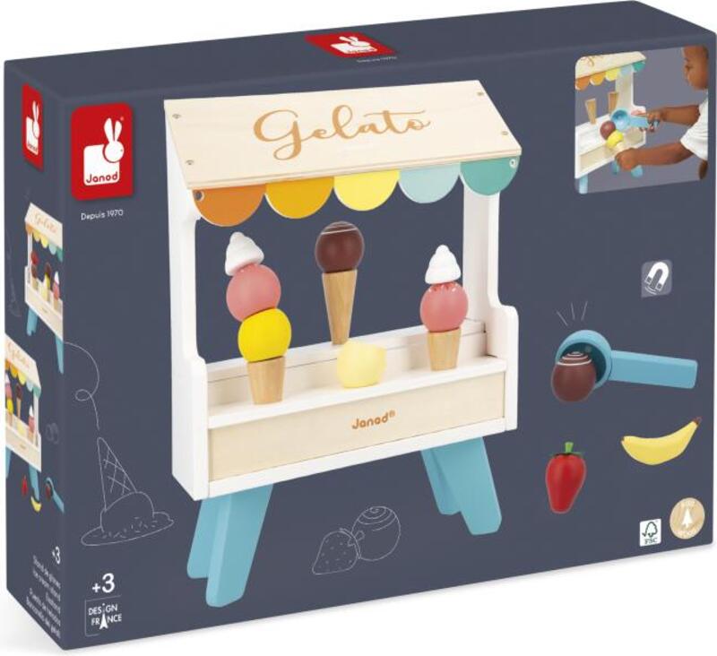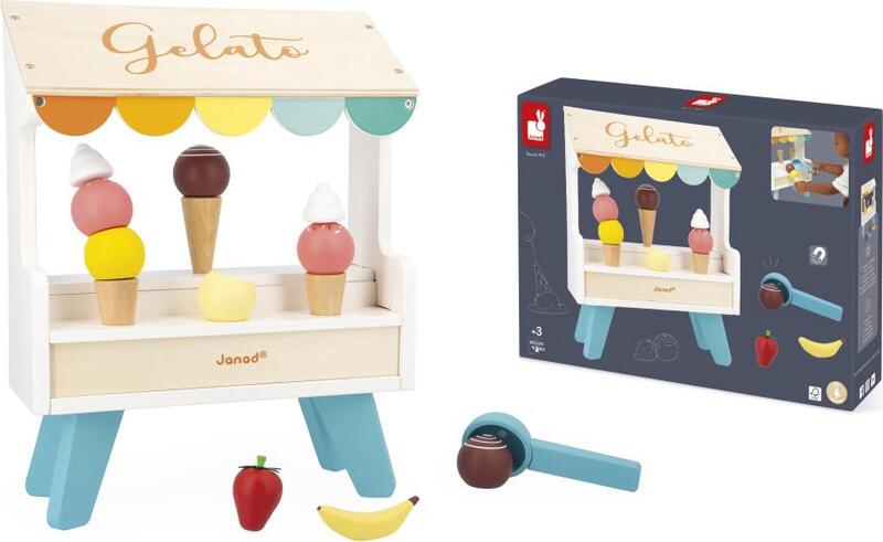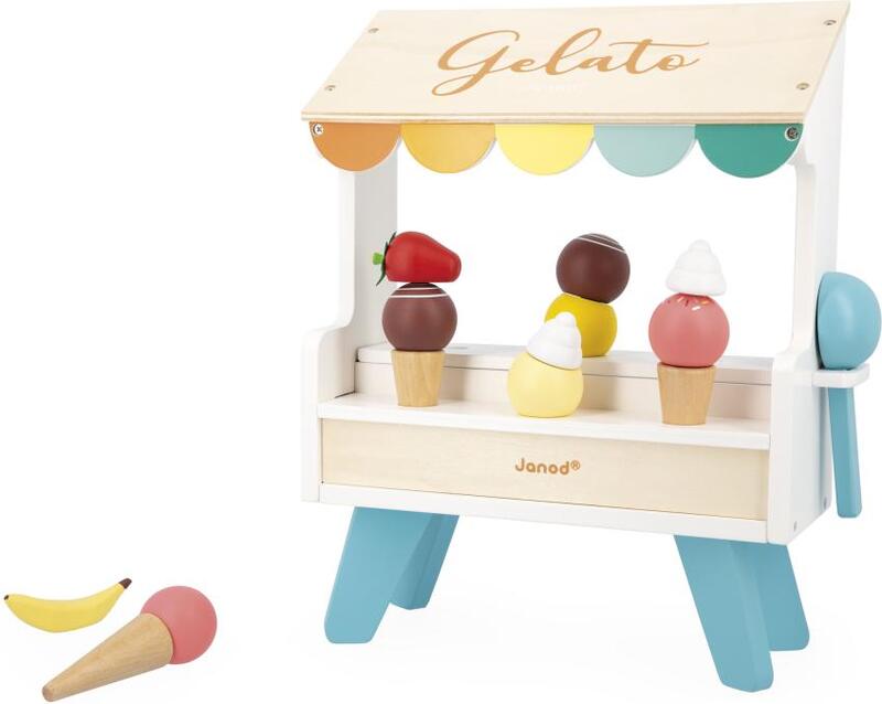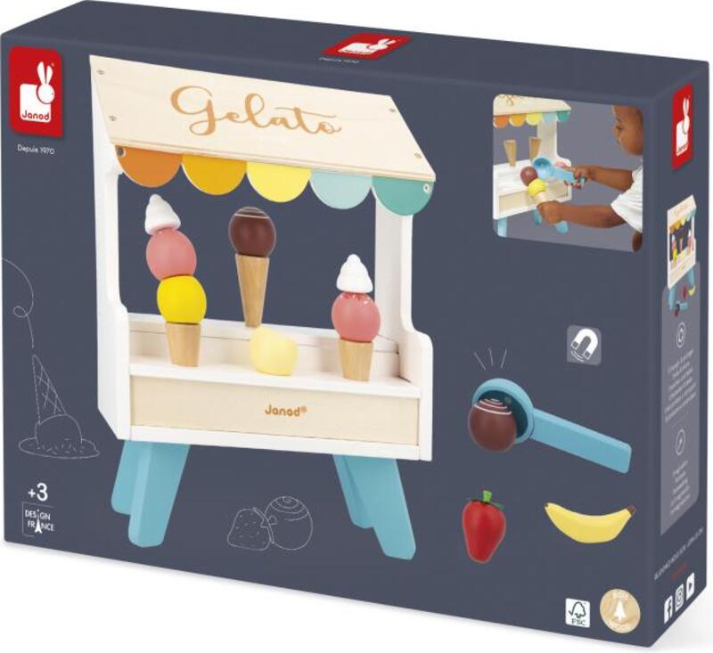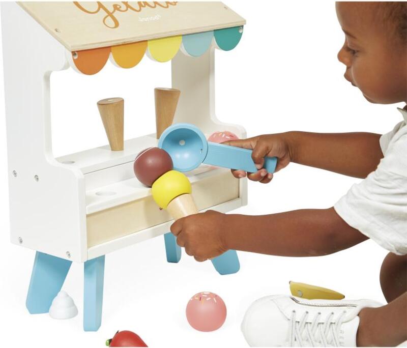 Dáte si kornútik vanilkovej alebo jahodovej zmrzliny? Drevený stánok so zmrzlinou je doslova sladká fantázia. Z praktických dôvodov sú kopčeky zmrzliny, naberačka a ďalšie doplnky magnetické. Z kornútika vám teda nič nespadne. Nájdete tu všetko pre pravých zmrzlinových labužníkov – 3 kornútiky, naberačku, 6 kopčekov zmrzliny rôznych farieb, k tomu ovocie a šľahačka. Už sa vám zbiehajú sliny?
