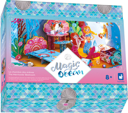 Táto miniatúrna krabička je ideálna na rozvoj trpezlivosti, šikovnosti a zmyslu pre detail u detí. Je ideálny na začatie vytvárania malých vesmírov! Čelo s medúzou, toaletný stolík z mušlí, truhlica s pokladom... Naša morská panna hostí svoju kamarátku na popoludnie na hranie pod oceánom a ocenila by malú pomoc pri zariaďovaní izby pred jej príchodom!