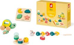 Škatuľka hračiek určená pre deti vo veku 18 mesiacov a viac: je to Janod Box! Táto detská krabička, špeciálne navrhnutá na zdokonalenie jemnej motoriky, obsahuje 4 zábavné vývojové hračky.