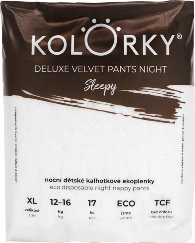 KOLORKY DELUXE VELVET PANTS NIGHT sú nočné nohavičkové plienky, ktoré sú určené pre pokojnú noc vašich malých neposedov. Plienky majú zamatový povrch, vyššiu absorpčnú vrstvu, pružné bočné manžety, elastický pás a indikátor vlhkosti. Pre ľahšiu výmenu plienky sa dá elastický pás po strane ľahko roztrhnúť, lepiaci pásik potom uľahčí zabalenie použitej plienky. Dizajn Sleepy vykúzli úsmev na tvári detí i dospelých. Plienky sú vyrobené z prírodných a obnoviteľných materiálov, ktoré sú bielené horúcim vzduchom úplne bez použitia chlóru metódou TCF (total chlorine free), tým sú šetrné k zdraviu a pokožke vášho dieťaťa. Plienky sú vyvinuté v ČR, dermatologicky testované a certifikované Štátnym zdravotným ústavom - SZÚ.