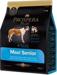 PROSPERA PLUS Maxi Senior je krmivo, ktoré je prispôsobené tak, aby spĺňalo meniace sa nutričné a fyziologické požiadavky starších psov veľkých a obrích plemien. Chondroprotektíva glukosamín a chondroitín pomáhajú posilňovať a stabilizovať kosti a kĺby. Krmivo je bohaté na vysoko kvalitné a ľahko stráviteľné kuracie mäso obohatené o psyllium, ktoré podporuje správny metabolizmus tukov a pomáha udržiavať správnu hladinu cholesterolu. Ingrediencie obsiahnuté v receptúre, fruktooligosacharidy a extrakt z kvasníc, posilňujú imunitu vášho psa. Prírodná Omega 3 mastné kyseliny z rybieho tuku spoločne s pupalkovým olejom zase prispievajú k zdravej srsti a krásne kožu.