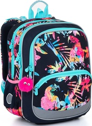Dvojkomorová ľahká taška BAZI je vhodná pre všetky dievčatá od 120 cm. S týmto farebným batohom sa každé dievča prenesie do amazonského dažďového pralesa, kde sa papagáje Ara cítia najlepšie.