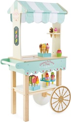 Klasický dvojkolesový zmrzlinový vozík s krásnym pruhovaným baldachýnom je bielo tyrkysový, má aj prvky z prírodného dreva. Mraznička je možné otvoriť a zavrieť pomocou posuvných dverí, nájdete tu aj ilustrácie klasických zmrzlinových príchutí, ktoré stimulujú predstavivosť. Vozík má tiež veľký úložný priestor a držiak na 2 kornúty, ktoré nájdete v balení. Vhodné na použitie s produktmi z kolekcie Honeybake – zmrzliny, zákusky, atď.