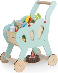 Štýlový drevený nákupný vozík deti odprevadí pri dobrodružstve na nákupoch. Kôš je rozdelený na 2 časti, naspodku je tiež textilná priehradka. Na malú tabuľku napíšte kriedou nákupný zoznam, nákup zabaľte do oddeliteľnej textilnej tašky.