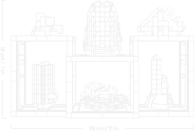 - Rozmery – Tento880-dielny zberateľský výstavný model LEGO® meria vyše 18 cm na výšku, 28 cm na šírku a 7 cm do hĺbky, keď sú všetky poličky umiestnené vedľa seba