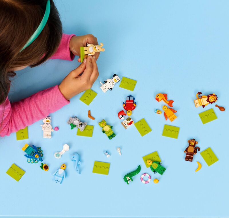 1 Z 12 HRAČKÁRSKYCH ZVIERAT – Deti sa môžu v balíčku s prekvapením tešiť na 1 z 12 zberateľských minifigúrok v kostýmoch leva, žaby, krokodíla, opice, koaly, papagája, psa, roztomilého zajačika, zlatej rybky, huňatej mačky, páva a delfína
