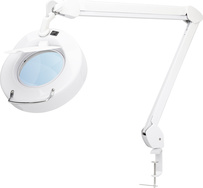 Energeticky úsporná LED lampa pre denné svetlo s vysoko kvalitnými zväčšovacími šošovkami. Flexibilné kĺbové rameno s dlhým dosahom na presné polohovanie bez preklzu. Vysoko kvalitná 125mm šošovka, 3 dioptrie (1,75x zväčšenie). 90 LED s farebnou teplotou 6400K, spotreba iba 6W, napájanie zo siete. Upevnenie k stolu je pomocou držiaka so skrutkou na okraj stola, v držiaku je lampa v otočnom čape.