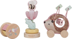 Darčekový set obsahuje tri krásne drevené hračky s nežnou potlačou motívov zo života na záhrade.