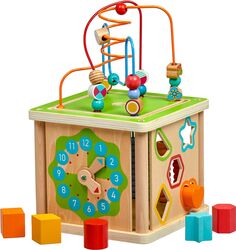 Drevená motorická kocka 5v1 s hodinami kombinuje niekoľko vzdelávacích a zábavných prvkov naraz.