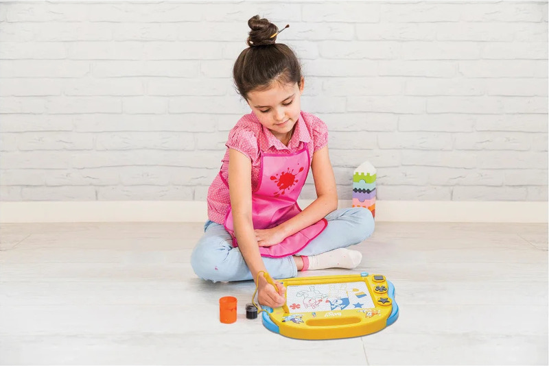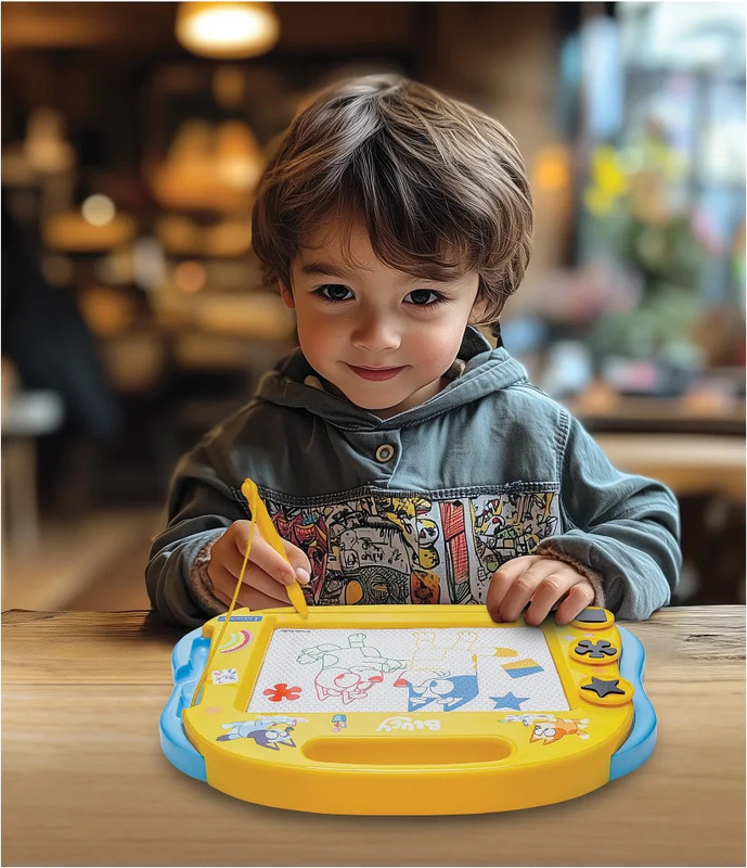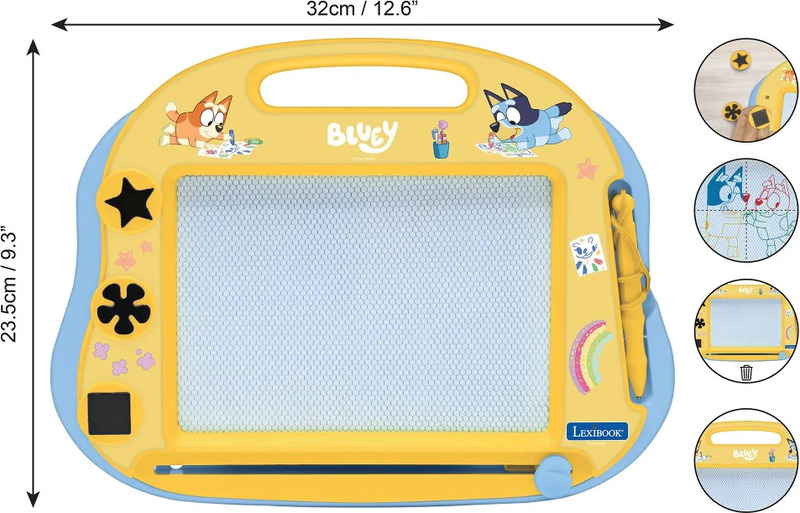 Upozornenie: Nevhodné pre deti do 3 rokov Táto skvelá magnetická kresliaca tabuľa povzbudí vaše deti, aby popustili svojej kreativite a predstavivosti! Skvelý modrý dizajn! Viacfarebná kresba pre hodiny zábavného kreslenia. Kreslite alebo píšte s priloženým perom a pečiatkami a jednoducho použite gumu na začatie odznova!