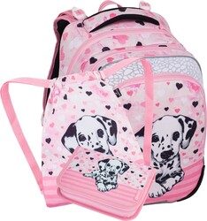 Batoh pre malé školáčky od 1. do 3. ročníka s dalmatíncom. Zaujme nielen svojím dizajnom, ale aj ľahkosťou - váži iba 0,98 kg. Vo vnútri sú tri veľké komory a organizér na drobnosti. Batoh s dalmatínskym motívom stojí na plastových nohách, chráni v tme svojimi reflexnými prvkami. Chrbtový systém s hrudným popruhom a bedrovým pásom má lekárske posúdenie. K batohu školáčky bude patriť peračník na písacie potreby a látková taška na papuče alebo športové oblečenie.Sada pre malých školákov od 1. do 3. triedy obsahuje