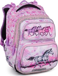 Jemný set s koníkmi pre malé školáčky od 1. do 3. triedy. Batoh je extra ľahký, pritom priestranný. Má dve veľké komory a dve praktické predné vrecká. Stojí na plastových nožičkách, v tme svietia reflexné prvky. Chrbtový systém s nastaviteľným hrudným pásom a odľahčeným vyberateľným bedrovým pásom má zdravotný posudok. K batohu bude školáčke ladiť peračník na písacie potreby a látkový vak na prezuvky alebo školský úbor.