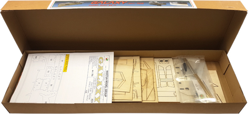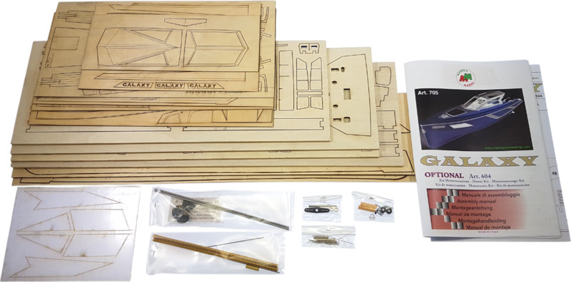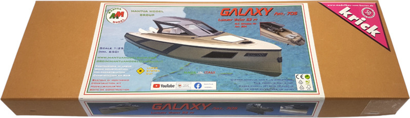 Stavebnica modelu lode Mantua Model Galaxy 53ft luxusná jachta 1:25. Obsahuje diely na stavbu modelu ako napríklad - laserom rezaná preglejka a ďalšie diely na detailné spracovanie, hriadele a dva lodné skrutky. Môže byť zostavená ako neplávajúca maketa aj RC model. Na zostavenie ako plávajúci RC model je k dispozícii pohonná sada so dvoma jednosmerným motorom (sada nie je súčasťou balenia). Samostatne je tiež potrebné dokúpiť ďalšie RC vybavenie ako regulátor, prijímač, vysielač, akumulátor a nabíjač. (Montáž pohonu, prípadne RC súpravy je určená pre skúsených modelárov, návod sa montážou nezabýva.) Podrobný návod s množstvom obrázkov a stavebnými plánmi vás prevedie stavbou jachty.