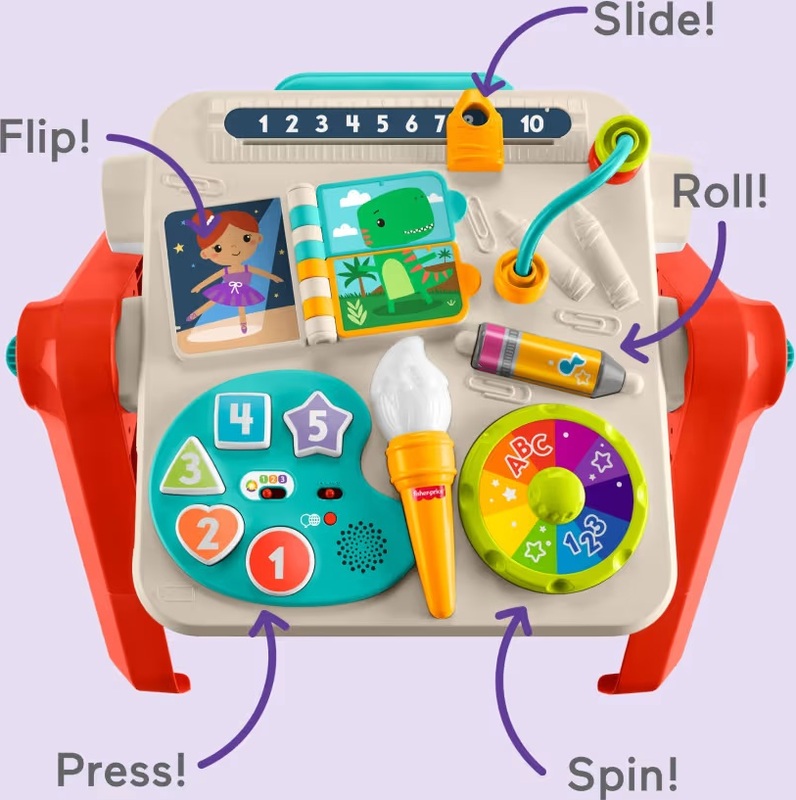 - Interaktivní aktivity: paleta umělce učící čísla, barvy a tvary, točící se barevné kolečko s hudbou, otočná knížka, korálková lišta a spinner