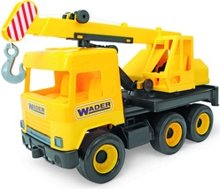 Middle Truck žeriav je veľké žlté vozidlo s dĺžkou 43 cm, ktoré má pohyblivé rameno a spúšťací hák na zdvíhanie a presúvanie rôznych konštrukčných prvkov.