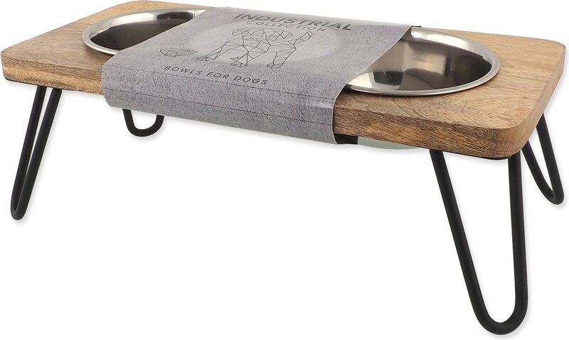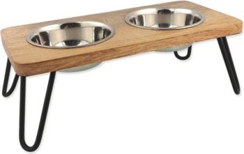 Štýlová a praktická dvojitá miska pre psov, ktorá spája moderný dizajn s funkčnosťou. Dve nerezové misky s objemom 450 ml sú ideálne na podávanie vody aj krmiva.Sú zasadené do pevného dreveného stojana so stabilnými železnými nohami, ktoré zabezpečujú odolnosť a dlhú životnosť. Misky sa dajú jednoducho vybrať a umyť, čo uľahčuje každodennú starostlivosť o čistotu. Vďaka vyvýšenej polohe je kŕmenie pre psa pohodlnejšie a šetrnejšie k jeho kĺbom a chrbtici.