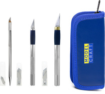 Modelcraft modelárske nože v puzdre (sada 18 ks) - modelárska rezacia sada v praktickej púzdre obsahuje: malý nôž s rydlom a čepeľou, profesionálny nôž malý a profesionálny nôž veľký. Priložené výmenné čepele rôznych typov pre široké spektrum rezov.