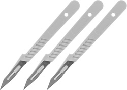 Modelcraft skalpel s rukoväťou 3ks v balení pre jemné rezy, ktoré sú potrebné pri špeciálnej modelárskej a kutilskej práci. Dodáva sa s nylonovou rukoväťou, vstavaným chráničom prstov a bezpečnostnou čiapočkou. Jednorazové použitie. Dĺžka 150mm, šírka 15mm.
