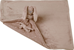 Okrem toho je vybavená mini plyšovým zajačikom, ktorého môžu malé rúčky a prstíky ľahko uchopiť. Hebký materiál deky poskytuje príjemný pocit na dotyk. Navyše je vybavená upevňovacou šnúrkou, aby sa cumlík nestratil.