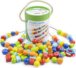 Farebné drevené korálky pre deti od 3 rokov. Balenie obsahuje 96 korálikov rôznych tvarov v šiestich farbách a 4 šnúrky. Ideálna hračka pre rozvoj motoriky a zrakového vnímania. Hra s korálkami podporuje rozpoznávanie farieb a počítanie. Môžete deťom určiť koľko korálikov av akých farbách majú za sebou navliecť. Rozmery balenia sú 12,5 x 12,5 x 16 cm.
