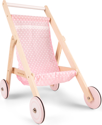 Pevná drevená konštrukcia kočíka je stabilná, kolieska sú opatrené gumovými krúžkami, vďaka tomu sa kočík pohybuje ticho a plynule. Pod sedadlom má kočík malý úložný priestor. Ideálne pre bábiky a plyšové hračky do 43 cm. Výška madla je 50 cm.