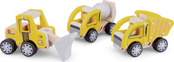 Sada drevených stavebných vozidiel pre deti od 18 mesiacov. Sada obsahuje žeriav, bager a nákladný automobil na cement. S týmto vozovým parkom pôjdu stavebné práce rýchlo a hladko. Súprava autíčok inšpiruje deti k nápaditej hre a umožňuje im vymýšľať a rozprávať príbehy. Hra rolí je pre deti skvelým spôsobom, ako porozumieť svetu okolo seba.