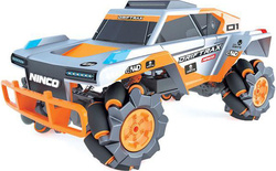 RC hračka pre deti NINCORACERS Driftrax má revolučné riešenie pohonu valčekovými kolesami. Tieto kolesá umožňujú modelu okrem klasického pohybu vpred, vzad a zatáčanie vľavo alebo vpravo aj jazdu do boku, pootočenie šikmo alebo otáčanie okolo svojej osi na mieste. Driftrax má oranžovo-striebornú karosériu vyrobenú z veľmi odolného plastu doplnenú polepy. Veľké valčekové kolesá umožňujúce jazdu prakticky akýmkoľvek smerom. Vpredu je opatrený masívnym ochranným rámom a podvozok je osadený funkčnými tlmičmi. Model má tiež možnosť pomocou programovacieho tlačidla navoliť sériu povelov, ktoré následne vykoná. Pri zapnutí sa model na privítanú zatrepe a vydá uvítaciu melódiu.
