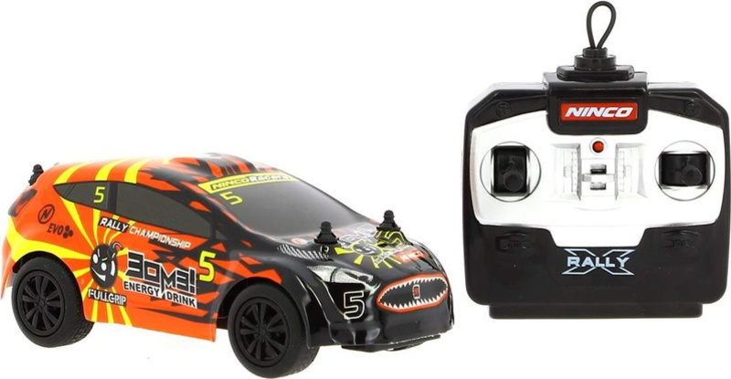 RC hračka pre deti Nincoracers X Rally Bomb v mierke 1:30, je vhodný najmä na použitie v interiéri. Jeho dĺžka je iba 14 centimetrov a prejdete s ním takmer všade. S týmto modelom sa Vaša detská izba razom zmení na trať pre domáce rally preteky. Karoséria je z odolného plastu. Je krásne farebne spracovaná. Kolesá s mäkkými pneumatikami dobre držia na všetkých povrchoch. Silný jednosmerný motor roztáča kolesá zadnej nápravy a poháňa model rýchlosťou 12 kilometrov za hodinu.