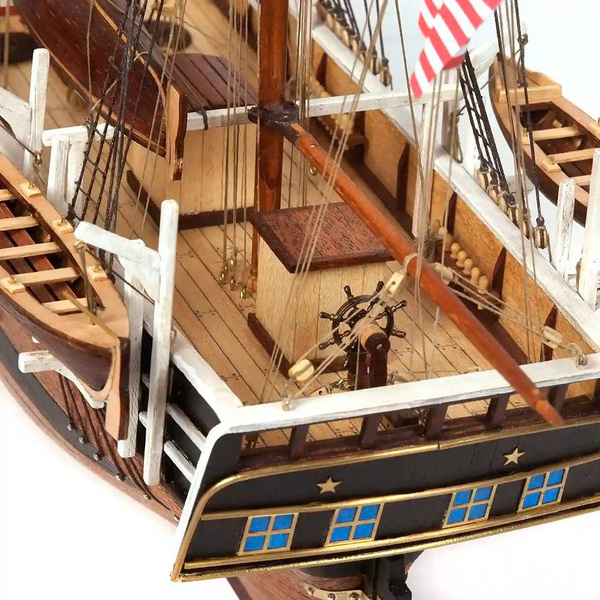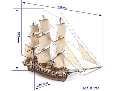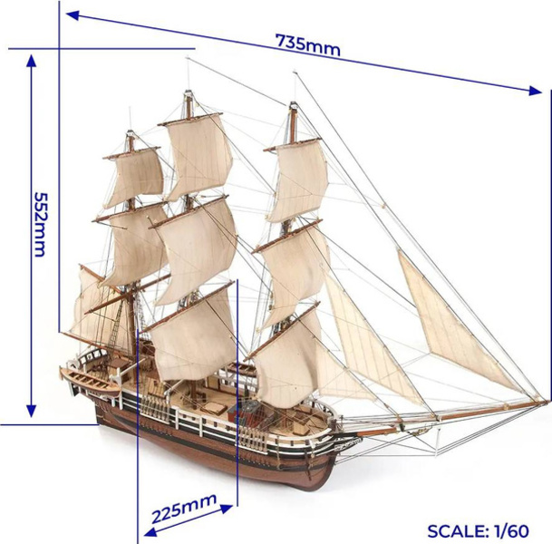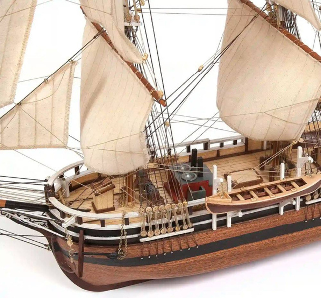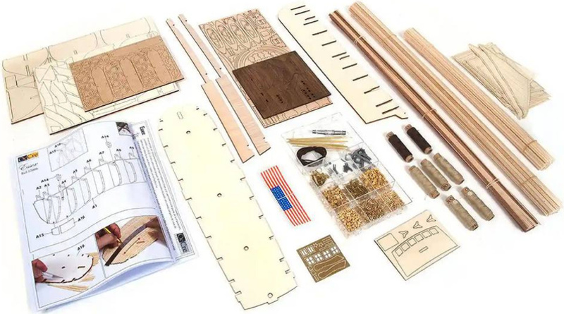 Balenie obsahuje laserom rezané plošné drevené diely, plaňky, stožiare, frézované drevené diely, kovové odliatky, mosadzné diely, mosadzné fotolepy, lanoví, ušité plachty, vlajku, stojan. Návod a stavebné výkresy.