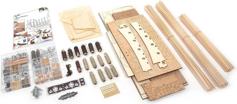 Balenie obsahuje laserom rezané plošné drevené diely, plaňky, stožiare, frézované drevené diely, kovové odliatky, mosadzné diely, mosadzné fotolepy, číre plastové dosky, lanoví, ušité plachty, vlajku, stojan. Návod a stavebné výkresy.