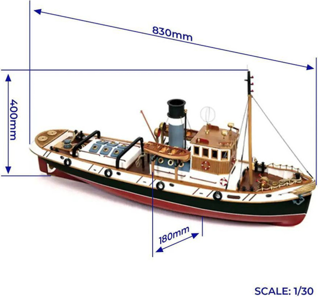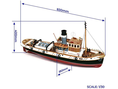 Stavebnica neplávajúceho (možnosť prestavby na RC) modelu lode OCCRE Ulises remorkér, v mierke 1:30. V balení sú diely na stavbu - laserom rezané diely, lišty, mosadzné fotolepy, lanoví a ďalšie. Stavebné výkresy a návod.