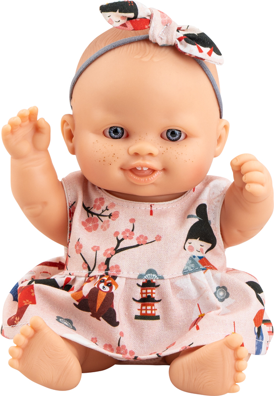 Los Peques Sara bábika v šatách s japonskými vzormi a čelenkou na hlave.