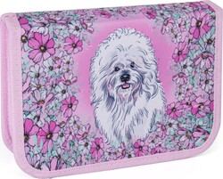 Peračník s drobnými kvetmi a psíkom pre malé školáčky na prvý stupeň. Gumové úchyty na dvoch chlopniach poskytujú dostatok miesta na všetky školské pomôcky. Školský peračník sa uzatvára kvalitným zipsom. Peračník s motívom psíka je ľahký a v batohu nezaberá veľa miesta.