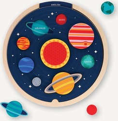 V jednej zábavnej hračke sa toho dá toľko naučiť! Preskúmajte zázraky vesmíru s týmto vkladacím dreveným výukovým puzzle. Vydajte sa na prehliadku slnečnej sústavy, kde sa dozviete poradie a veľkosti Slnka a ôsmich hlavných planét na ho obežnej dráhe. Umiestnite drevené dieliky v tvare planét do otvoru na základovej doske v tvare zemegule a naučte sa názvy jednotlivých planét v angličtine, holandčine, francúzštine, nemčine, italčine a španielčine jednoduchým preskladaním jazykových kariet. Použite priložený návod a ukážte, čo viete! Viacjazyčná skládačka je ideálna pre deti od 3 rokov, rozvíja koordináciu ruka-oko, rečové a jazykové schopnosti a kognitívne schopnosti. Puzzle je vyrobené z FSC dreva a obal je vyrobený zo 75% z recyklovaných materiálov a FSC papiera potlačeného rastlinnými inkousty.