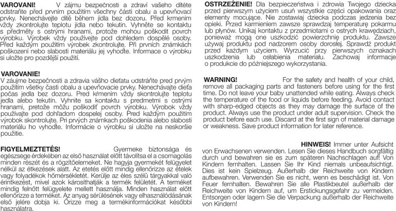 UPOZORNENIE! V záujme bezpečnosti a zdravia vášho dieťaťa odstráňte pred prvým použitím všetky časti obalu a upevňovacie prvky. Nenechávajte dieťa počas jedla bez dozoru. Pred kŕmením vždy skontrolujte teplotu jedla alebo tekutín. Vyhnite sa kontaktu s predmetmi s ostrými hranami, pretože môžu poškodiť povrch výrobku. Výrobok vždy používajte pod dohľadom dospelej osoby. Pred každým použitím výrobok skontrolujte. Pri prvých známkach poškodenia alebo slabosti materiálu ho vyhoďte. Informácie o výrobku si uložte na neskoršie použite.