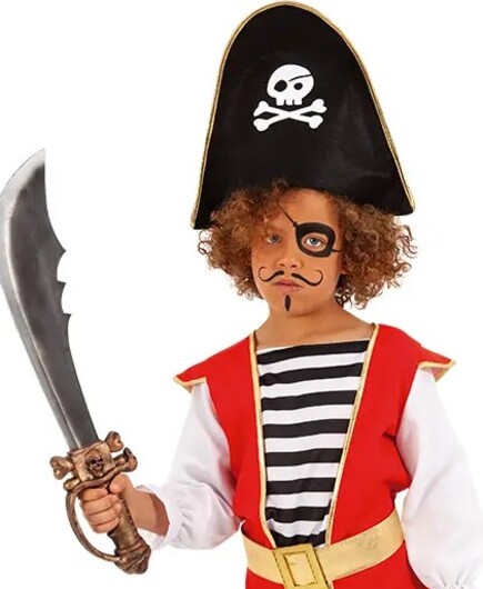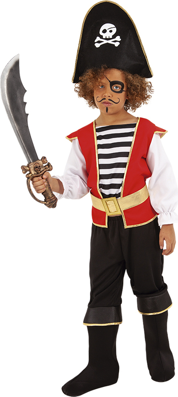 Nezbedný Pirátsky kostým pre deti pozostávajúci z klobúka, košele s vestou, nohavíc s návlekmi na topánky a opasku. Pozvite svojich priateľov, aby vytvorili skupinu pirátov hľadajúcich skryté poklady. Vydajte sa na šíre more objavovať nové krajiny, kde sú ukryté bohatstvá, a vy ich nájdete ako prví. Ideálne na narodeniny, Halloween a kostýmové párty.