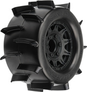 Kompletné kolesá Pro-Line pre RC modely áut 1:10. Rozmer ?131x67 mm. Disk Raid má čiernu farbu. Pádlové pneumatiky Sand Paw 2.8" MT, tvrdosť zmesi Z3 (stredná). Unášač je šesťhran 12 mm.
