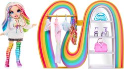 Rozšírte svoju fantáziu s novým dúhovým šatníkom od Amayi. Darčeková sada „všetko v jednom“ obsahuje exkluzívnu bábiku s dúhovými vlasmi a čižmami, ďalšie módne doplnky zavesené na vešiaku na oblečenie, viacvrstvové police, kabelky a topánky. Deti sa pri obliekaní svojej obľúbenej bábiky skvele zabavia.Herná sada Dúhový šatník. Obsahuje exkluzívnu nevyhnutnú bábiku, vešiak na oblečenie, vešiaky, oblečenie, viacvrstvové police, topánky a kabelky.