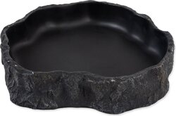 Miska na vodu či krmivo pre plazy, obojživelníky a ďalšie druhy zvierat, v čiernom dizajne. Atraktívny čierny dizajn, hodiaci sa obzvlášť k tmavým pieskom a substrátom. Široká základňa a váha misky zabraňuje prevrhnutiu zvieraťom. Vnútorná plocha je striekaná, tým pádom minimalizuje tvorbu baktérií, veľmi dobre sa čistí, nelepia na ňu nečistoty, a tak sa aj ľahko dezinfikuje. Dizajn umožňuje nielen pitie, ale aj stočenie vo vnútri misky. Niektoré menšie druhy hadov, alebo mláďatá sa rada do misky chúlia, obzvlášť potom v letných mesiacoch, kedy im voda poslúži na ochladenie. Vyrobené z ekologického živicového materiálu. Rozmery 19,5 x 17,5 x 4,2 cm.