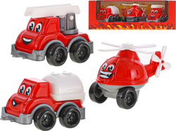 Sada troch kusov hasičských vozidiel v detskom dizajne s očami.Autá sú plastové a merajú 11 cm.