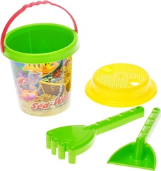 Sada na piesok vodný svet obsahuje vedierko, sitko, hrabličky, lopatku.